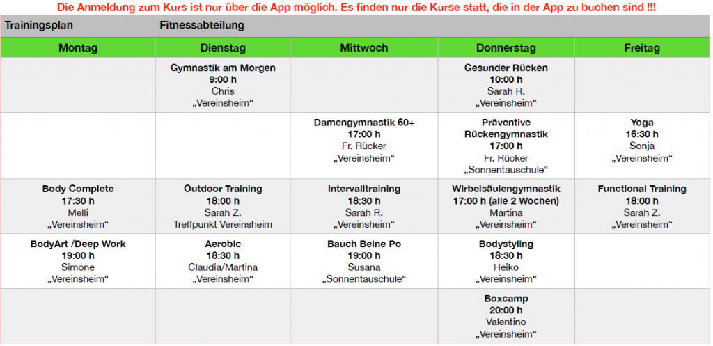 Schon kommenden Woche starten unsere Fitness-Kurse (siehe Plan unten), nach Ferienende legen auch die anderen Abteilungen wieder los.