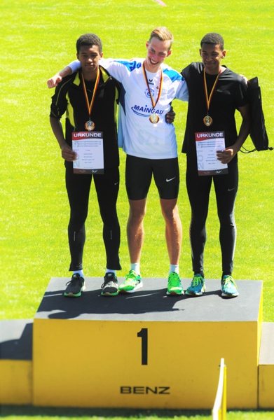 Der deutsche Meister über 400 m der Männlichen Jugend U20 heißt wie schon im letzten Jahr Constantin Schmidt und kommt von der TG Obertshausen! Nach verhaltenem Rennbeginn sicherte er sich mit gewohnt starker Zielgerade den Titel. Dabei hatte er in 47,22 Sekunden ganze sechs Zehntel Vorsprung vor seinen beiden Trainingskameraden Jaakkima und Aleksi Rösler, die den Dreifach-Triumph von Trainer Robert Schieferer perfekt machten.