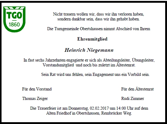 In Dankbarkeit nimmt die Turngemeinde Obertshausen Abschied von Heinrich Niegemann. Wir trauern mit seiner Frau Marga und seiner Familie.