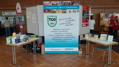 Auch die TGO war am vergangenen Sonntag mit einem Stand beim „Tag der Vereine“ im Bürgerhaus vertreten. Dank einer von der MAINGAU Energie gesponserten neuen Werbewand konnte zahlreichen Interessenten das Kursprogramm vorgestellt werden.