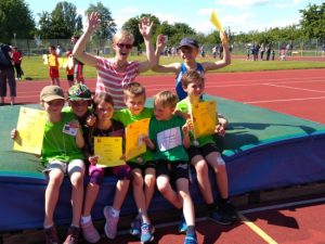 Für das U10-Team standen 40m-Sprint, eine Hindernis-Staffel, Hoch-Weitsprung, Heuler-Wurf und Medizinball-Stoßen auf dem Programm. Alle Sportler zeigten vollen Einsatz und konnten sich am Ende über den dritten Platz sowie eine „echte“ Bronzemedaille freuen, da der Wettkampf auch als „Kinderleichtathletik-Kreismeisterschaft“ gewertet wird.