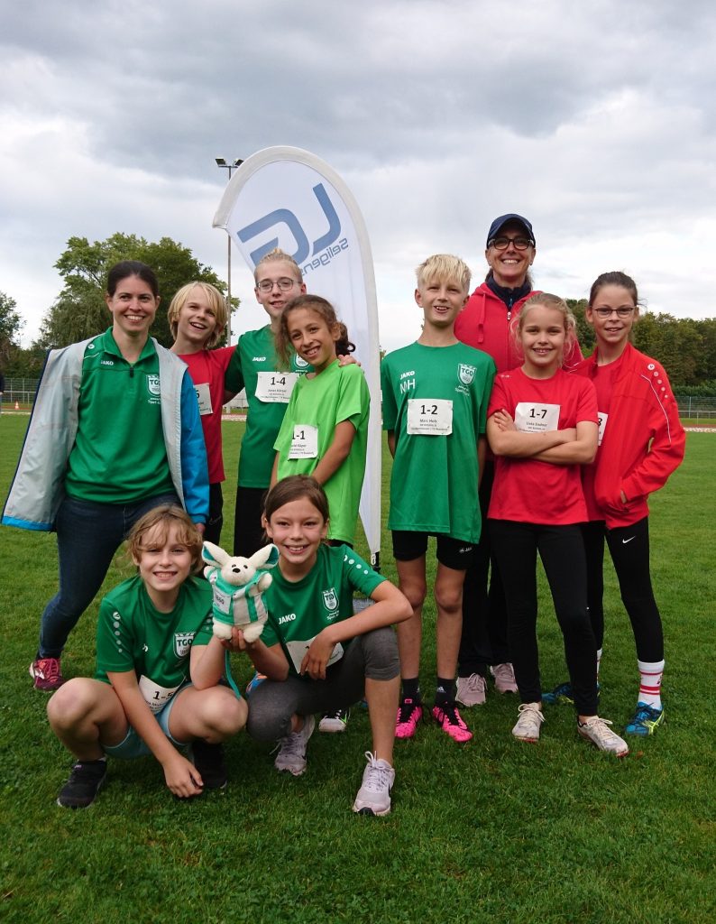 In der Altersklasse U10 konnten die Trainerinnen Janine Fröhlich und Lena Schirholz ein voll besetztes Team mit elf Kindern ins Rennen gegen zehn weitere Mannschaften schicken. Unter den lautstarken Anfeuerungsrufen sämtlicher Familienmitglieder begannen die Wettkämpfe mit einer Hindernisstaffel, gefolgt von koordinativ anspruchsvollen Wechselsprüngen durch Fahrradreifen, Heuler-Wurf und Stabweitsprung. Nach diesen vier Disziplinen lagen die „TG Ollis“ auf dem dritten Gesamtplatz, den es im abschließenden Biathlon-Lauf zu verteidigen galt. In einem hochspannenden Rennen gaben die Kinder alles, wurden aber letztlich noch von einer sehr ausdauerstarken Mannschaft überholt. Somit belegten die Ollis den vierten Platz in der Gesamtwertung – ein sehr schöner Erfolg zum Abschluss der Saison!