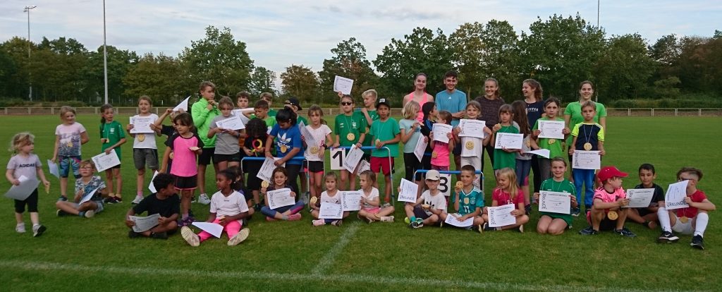 Die Objekte der Begierde sind rund, süß und haben ein breites Lächeln auf den Lippen – die „Keksmedaillen“, die es traditionell zum Abschluss der Freiluftsaison bei den Vereinsmeisterschaften zu gewinnen gibt. Vierzig Nachwuchsleichtathleten wetteiferten bei herrlichem Spätsommerwetter um die Teig-Smileys und stellten im Hindernissprint, Wurf-Dreikampf und Weitsprung ihr Können unter Beweis. Einziger Nachteil: Die meisten Medaillen überleben gerade noch so das Abschlussfoto, bevor sie im Mund verschwinden :-)