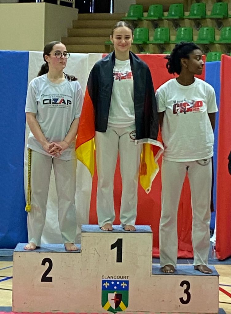 Am vergangenen Wochenende nahmen die Geschwister Maria Beatriz (Foto oben) und Maria Clara (Foto unten) Nicoletti Sahd an einem Capoeira-Wettkampf in Paris teil. Das harte Training der letzten Wochen hat sich bezahlt gemacht: Beide Mädchen erreichten in der Kategorie „Solo“ jeweils den dritten Platz. In der Kategorie „Zweikampf“ konnte Maria Beatriz in ihrer Altersklasse sogar den ersten Platz bejubeln, Maria Clara wurde Vierte. Trainer Angolano ist sehr stolz auf die Leistung seiner Athletinnen und freut sich, dass die beiden den Verein bei einem internationalen Wettkampf so gut vertreten haben.