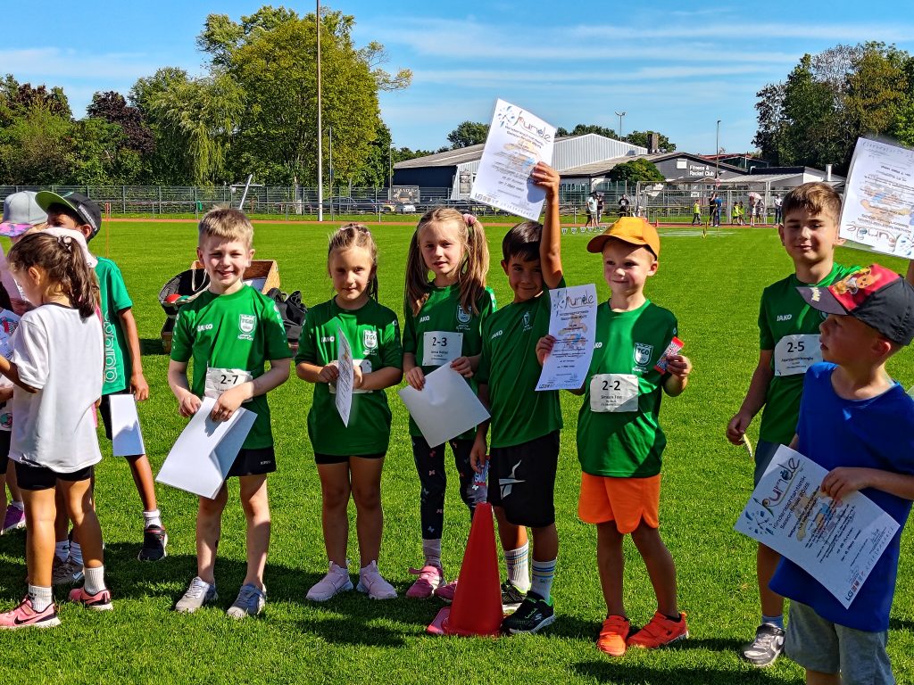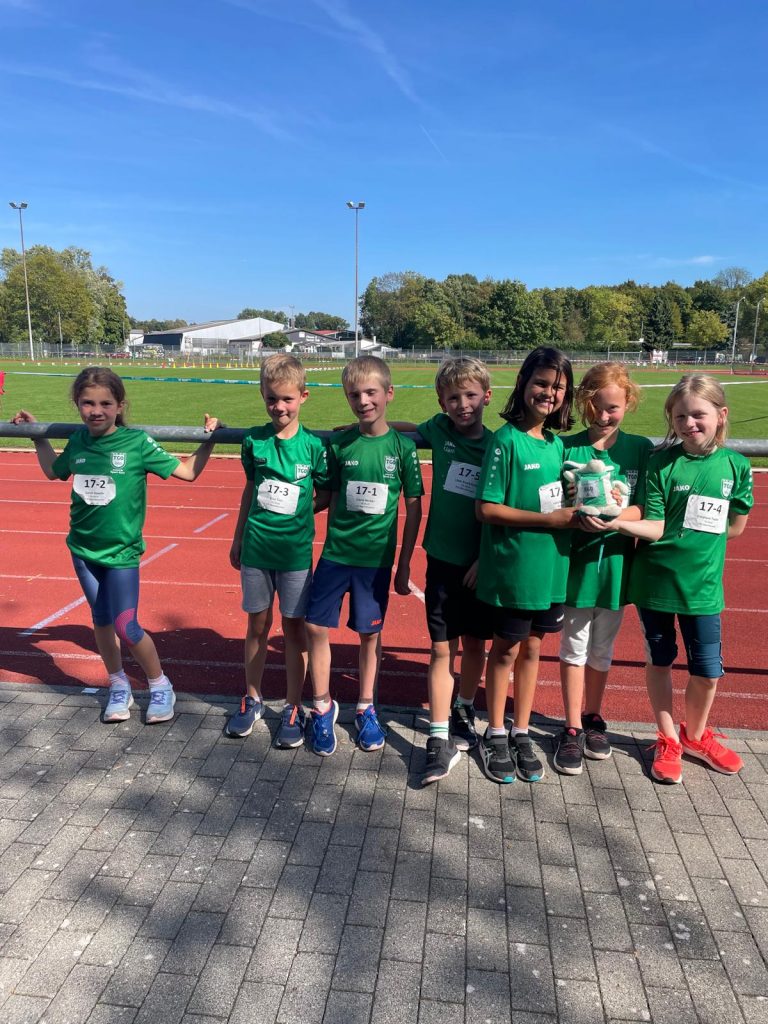 Besser hätte die Freiluftsaison in der Kinderleichtathletik nicht enden können: Souverän sicherte sich das U12-Team am Endes eines langen Wettkampftages in Seligenstadt den ersten Platz und die ersehnte Goldmedaille. Sowohl in der 6x50m-Hürden-Staffel als auch in der Variante ohne Hindernisse und im Stabweitsprung stand das Team an der Spitze, beim Werfen ging Platz zwei in die Wertung ein. Somit war die Motivation groß, auch beim abschließenden 1500m-Stadioncross nochmal alles zu geben, um die Führung zu verteidigen. Alle Kinder wuchsen über sich hinaus und legten einen tollen Lauf hin, sodass auch in dieser Disziplin keine andere Mannschaft schneller war und die „TG Ollis“ unter großem Jubel als Sieger verkündet wurden.